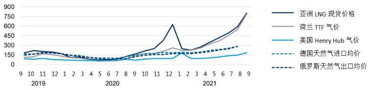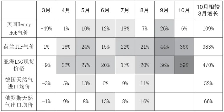 以2021年3月為基期,截至2021年10月,歐洲和亞洲天然氣月均價格已分別上漲了近4倍和近5倍。在經(jīng)濟(jì)全球化背景下,能源問題持續(xù)發(fā)酵,能源供應(yīng)短缺正在全球蔓延。
