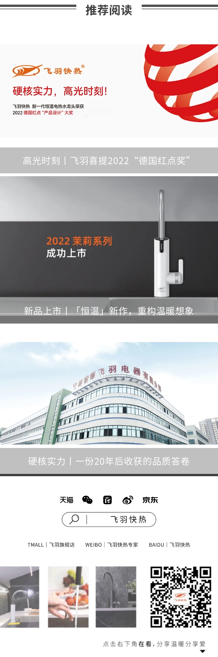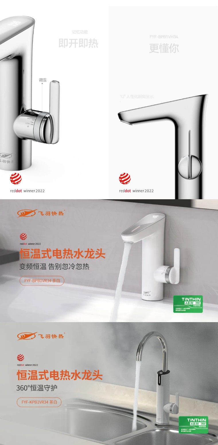 2022年新上市的恒溫電水龍頭·茉莉,搭載新一代霆芯A Series變頻恒溫安全內(nèi)膽,解決了傳統(tǒng)電熱水龍頭使用時水溫忽冷忽熱的痛點,一鍵即刻獲取恒溫熱水,打造業(yè)內(nèi)首款的“真恒溫”電熱水龍頭。該產(chǎn)品榮獲2022年德國紅點產(chǎn)品設(shè)計大獎,該獎項被譽為“設(shè)計界的奧斯卡”,也是全球公認的工業(yè)設(shè)計殿堂級獎項。