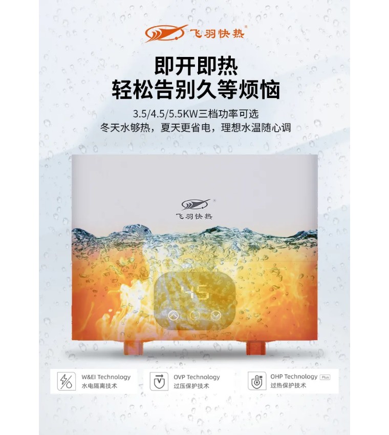 飛羽快熱即熱式電熱水器,告別傳統(tǒng)電熱水器的預(yù)熱模式和龐大體型,在體積和安裝上做到了大程度的精簡。輕薄機身搭配IPX4防水防濺,直接可以安裝在浴室里面,既不占空間又出熱水快,是現(xiàn)代城市生活的優(yōu)質(zhì)選擇。