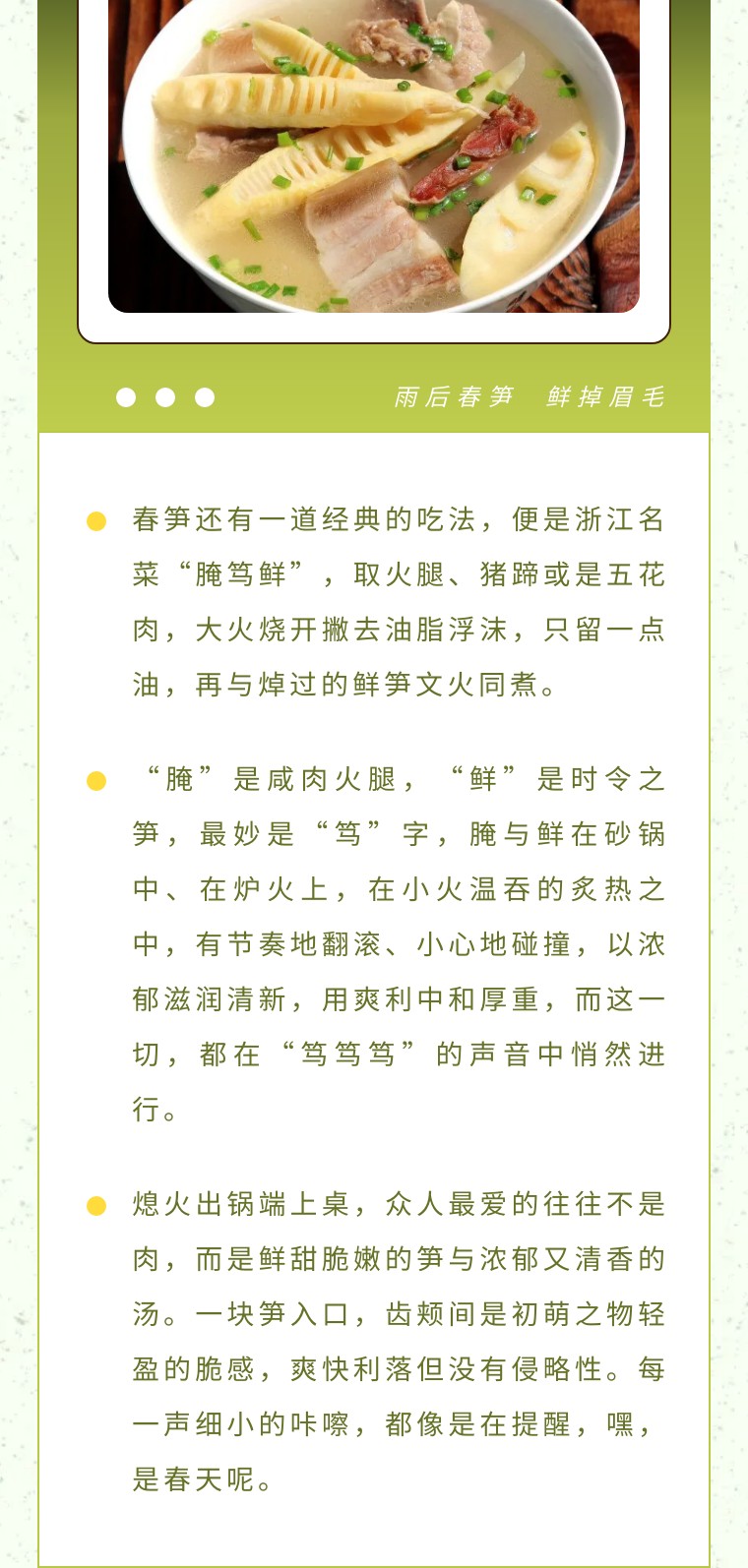 短短幾十天的嘗鮮期,其脆爽、清甜,卻讓吃客們難以抗拒、食之難忘。南方有一句話:“食過(guò)春筍,才方知春之味”。