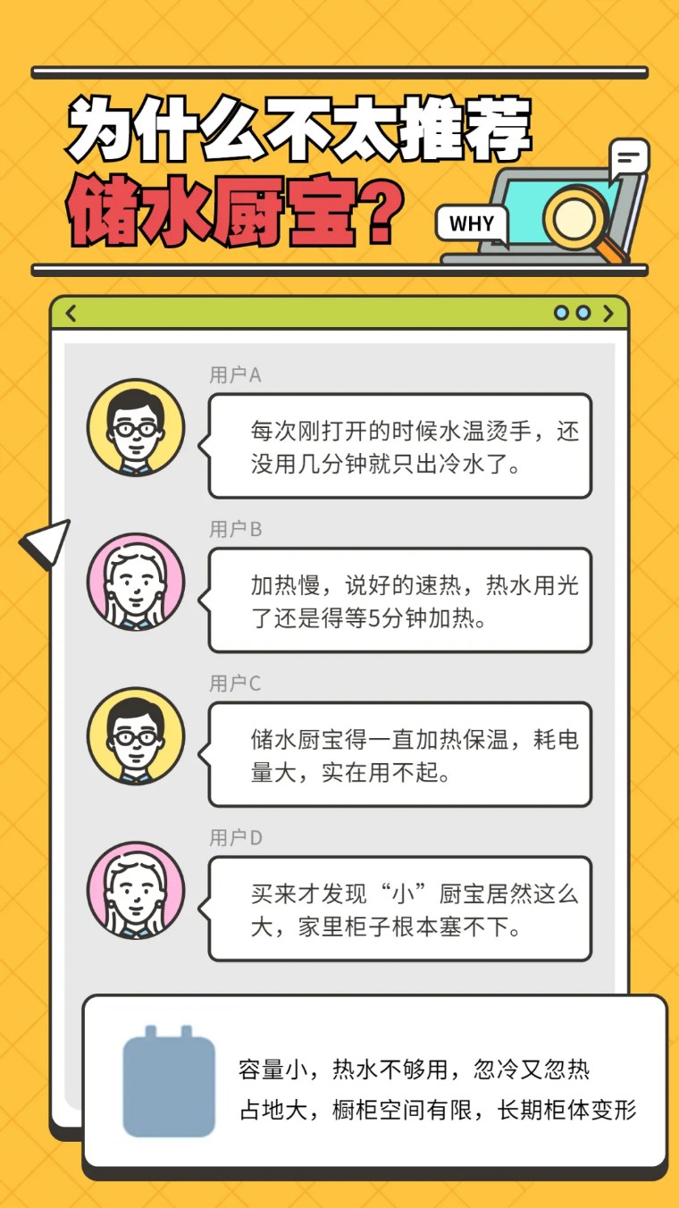 而且許多用戶使用后反饋,儲(chǔ)水式小廚寶的能耗很高,為了保持水溫,內(nèi)膽里的水不斷被反復(fù)加熱,家里的電費(fèi)都在蹭蹭蹭得上漲。長(zhǎng)時(shí)間工作,機(jī)器的壽命也被縮減。