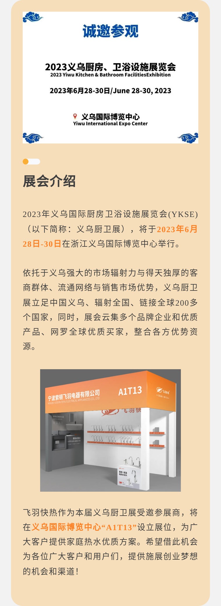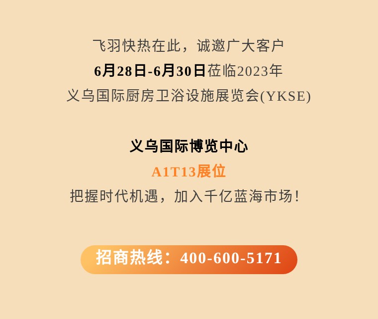 2023年義烏國(guó)際廚房衛(wèi)浴設(shè)施展覽會(huì)(YKSE)(以下簡(jiǎn)稱(chēng):義烏廚衛(wèi)展),將于2023年6月28日-30日在浙江義烏國(guó)際博覽中心舉行。飛羽快熱作為本屆義烏廚衛(wèi)展受邀參展商,將在義烏國(guó)際博覽中心“A1T13”設(shè)立展位,為廣大客戶(hù)提供家庭熱水優(yōu)質(zhì)方案。希望借此機(jī)會(huì)為各位廣大客戶(hù)和用戶(hù)們,提供施展創(chuàng)業(yè)夢(mèng)想的機(jī)會(huì)和渠道!