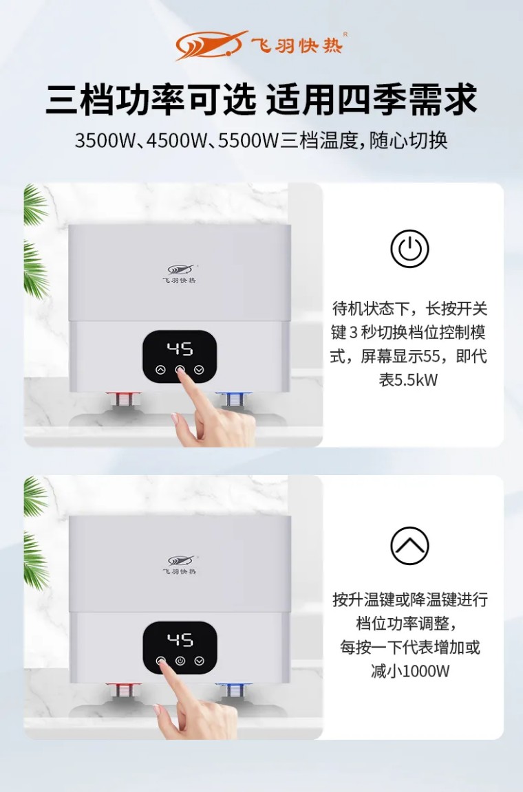 并且,飛羽快熱即熱式小廚寶支持三檔加熱功率調節(jié),可根據(jù)家庭電路狀態(tài)和季節(jié)性使用需求,自行切換3.5kW/4.5kW/5.5kW三檔加熱功率;夏天用3.4kW加熱功率,水溫不燙更省電,冬天用5.5kW加熱功率,出熱水快更暢洗。