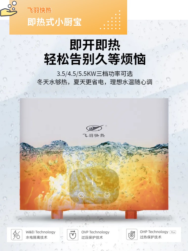 無論在廚房、衛(wèi)生間或者是陽臺,只要有冷水管和電源,飛羽快熱即熱式小廚寶都可以提供源源不斷的熱水,方便人們隨時取用。告別傳統(tǒng)水管傳輸?shù)馁M時費水,小廚寶熱水更快,也更省電,使用場景靈活多變。